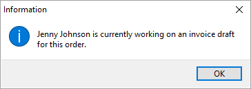 An invoice cannot be edited by two people at the same time. If you attempt to open an invoice that is being edited by another person, then you receive a warning with the person’s named followed by, “ is currently working on an invoice draft for this order.” Refer to Invoice Lock for details.
