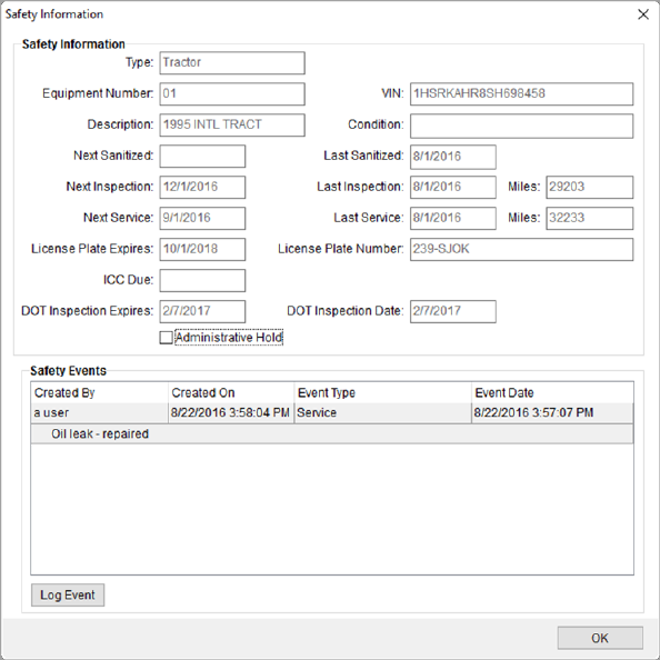 Use the Safety Information (Equipment) screen to view key safety data and log safety events for equipment records.