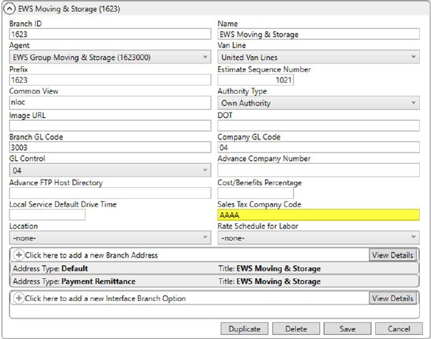 MoversSuite Administration > Administration > Branch Setup