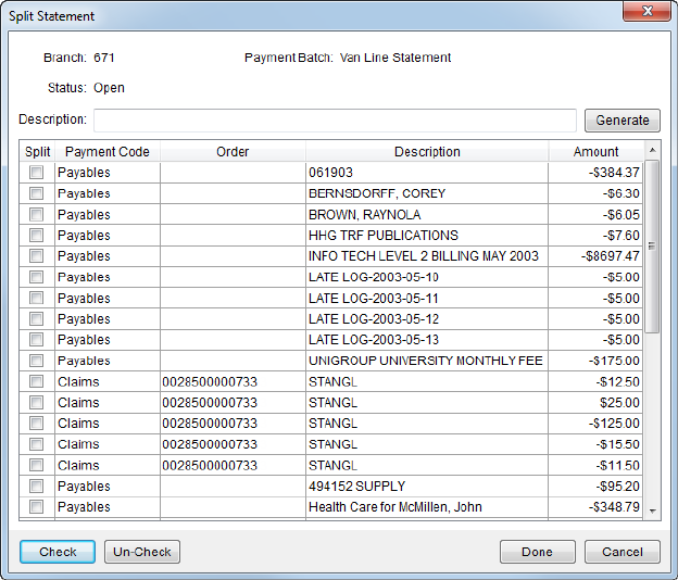 Generate This function creates a split containing all records selected in the Split column. Users will receive a confirmation to proceed with the split creation or to cancel it. Users can generate any number of splits to break up a batch, such as separating all payables (Payment Code of “Payables”) together in a split group titled “A/P.”