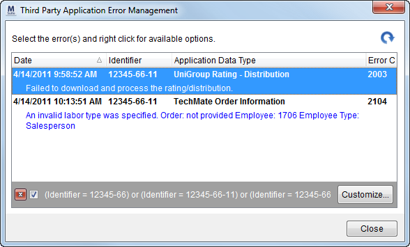 The Third Party Application Error Management screen displays errors associated to completed data exchanges (primary downloads) made between MoversSuite and third party applications such as UniGroup and SIRVA. Errors and warnings associated with records in a pending process state will be displayed within the Third Party Interface Order Monitor.