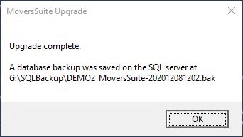 The Upgrade Tool streamlines all the functions of the deploy process into a simple dialog with a few prompts and performs all necessary tasks including requirements check, database backup, and the installation of the MoversSuite application and related products.