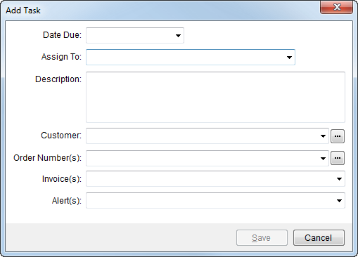 Available through the Alerts/Tasks pane and through Workflow (AR Credit & Collections), the Add Task screen allows a user to define a customer task based on one or more orders, invoices, and alerts.