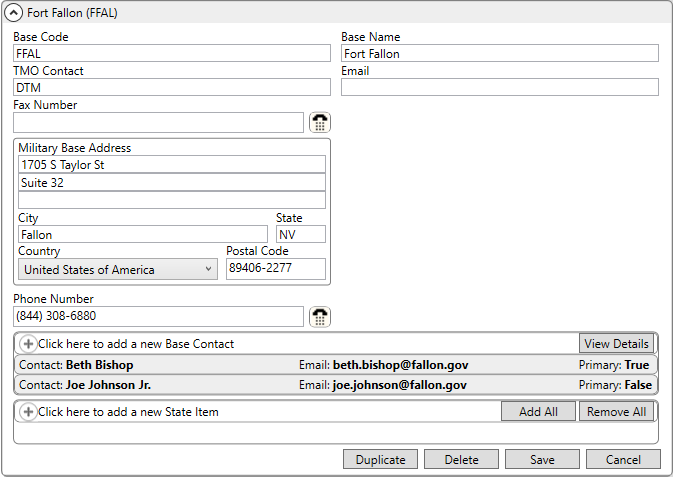 Associate contacts for the base within this section. Contact records appear for bases within the Military/Government tab. You can also add and edit the base contact records through the Base Information screen. Refer to Add Base Contact for specifics. Use the View Details buttons in this section for additional viewing and editing options.