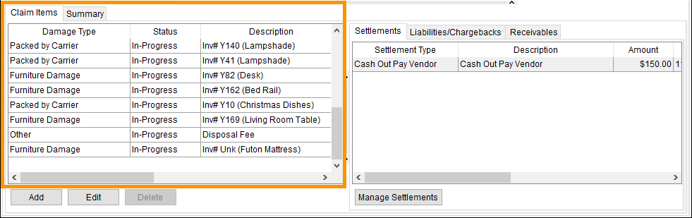 If there are items settled within the Settlement tab (in the section to the right), clicking on a Claim Item will list the Settlements for that item. If there are, the application will highlight items settled through the Settlement Entry screen. Likewise, click on the Liabilities/Chargebacks or Receivables tab to see related Claim items when the tabs are selected. Use the “Manage….” Button at the bottom of the tab to add, edit, and manage the claim item.