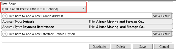To add the time punches through the Add Punches screen in the MoversSuite application, a Time Zone must be affiliated to the branch in the Branch Setup. To do so, simply select a Time Zone from the Time Zone drop down menu right above the Branch Address in Branch Setup and press Save.