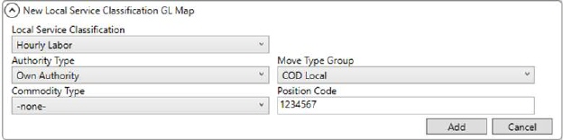 For each defined Classification, you can create any number of mapping records within the Local Service Classification GL Map Setup. These records identify the Position Code for the Classification based on any combination of Authority Type, Move Type Group, and/or Commodity Type (Commodity Setup) set on the order.