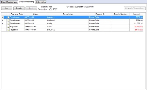 The Detail Processing tab allows a user to add and delete items from a manual batch (for general payments or cash receipts) and apply payments and charges for all open batches.This tab is available through Payment Management.