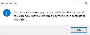 4. An informational message dialog will appear saying “Your new electronic payments batch has been created. You can now move electronic payment cash receipts to this batch.”