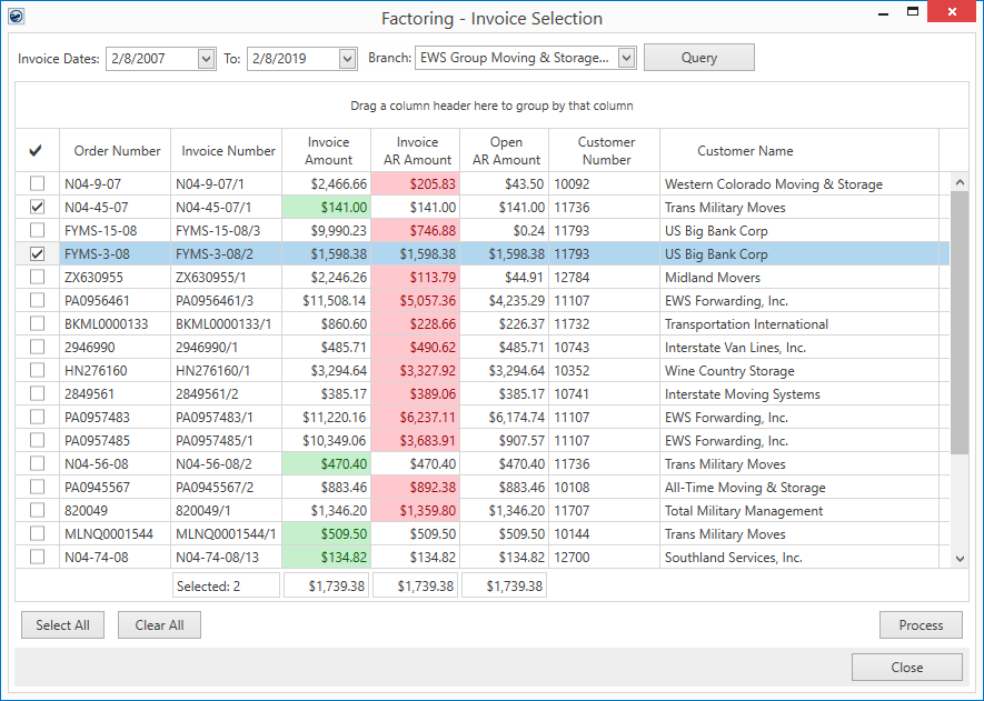 Mark all qualified records in the data grid with a checkmark to include each in the batch created when Process is pressed. The application only selects those records that have an Invoice Amount equal to the Invoice AR Amount.