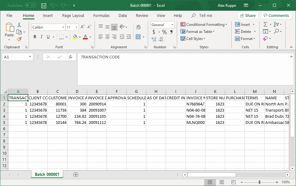 The CSV batch file provides entries for each invoice included. View the Factoring File Record Layout topic for file details.