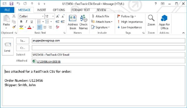 Selecting the FastTrack CSV Email option opens new email message to the driver or crew lead containing the comma-separated values (CSV) file containing the FastTrack data. The email body contains the Order Number and Shipper name.