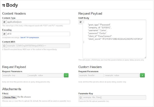 { "grant_type":"Password", "company_id":"YourCompanyID", "username":"YourMobileUser", "password":"YouMobileUserPassword", "client_id":"CrewConnect", "client_secret":"7FC113A41D8E4EE6AAD26D79743F9A34" }