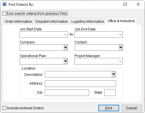 Described in the table are the fields available within the Office and Industrial tab of a Find Order(s) By find. Refer to the Find topic for information on Find functionality, such as the Use search criteria from previous Find flag.