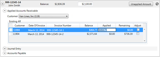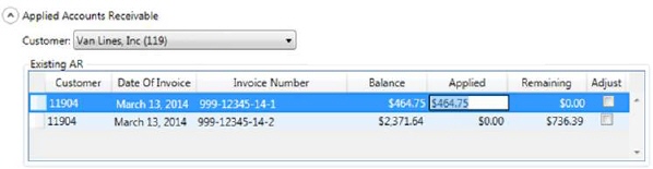 Revenue received from a van line and invoiced items such as recurring storage apply at the Invoice Level. The items with an open balance for the selected Customer display within the Applied Accounts Receivable section.