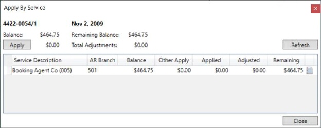 The Balance computes as the total of all items less the amounts of Other Apply and Applied and less any adjustments made at the Service Code Level. Double-click this record to view the Service Code details (through the Apply by Service dialog).