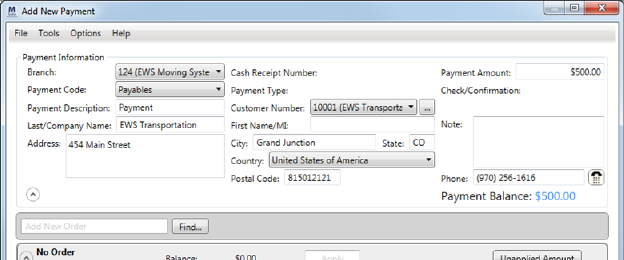MoversSuite applies the amount entered to accounting documents (transactions) associated to the order beginning in the order the documents were created, oldest documents first. Only transactions with a balance display for the order.