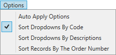 By default, dropdown menus in this screen display items by their description. Users have a choice of keeping this sort option or choosing to sort by Code (item identifier).  This feature pertains to dropdown menus that contain both the description and code, such as the Customer and Service Code fields.