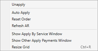 Apply payments and charges beginning with the oldest documents (transactions) in the grid and move up the list until the amount has been fully applied or the Payment Balance reaches zero.