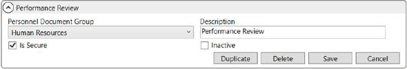 Use the Personnel Document Group Setup to define the categories you wish to arrange documents under within the Personnel Information screen.