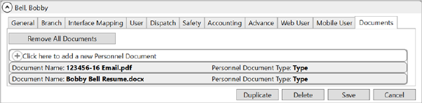 Note: Users must have appropriate access to the Local Dispatch and/or Long Distance Dispatch modules to view and add Personnel Documents. This assignment is made through Security Profile Setup.