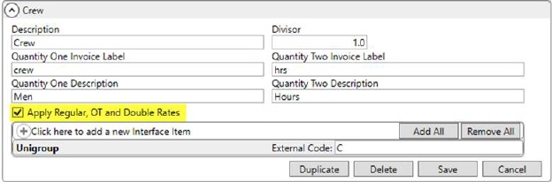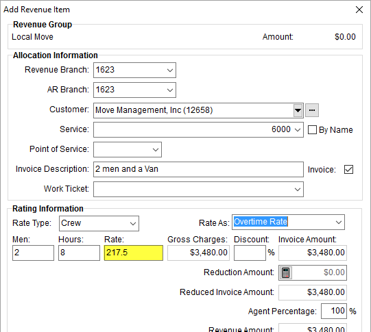 In the example below (Figure 11), selecting the Overtime Rate option pulled in the OT Rate of $217.50 from the Rate Plan.