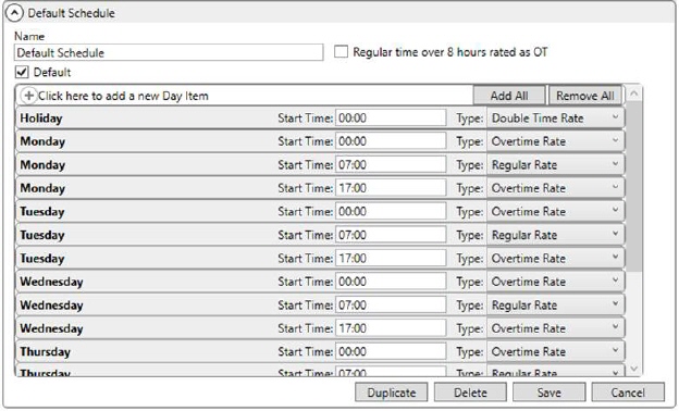 Additionally, you can instruct the application to assign a default rate based on the day of the week and the time of day through the Rate Schedule for Labor. This setup allows you to control when you wish to automatically apply overtime or double rates based on the date of service.