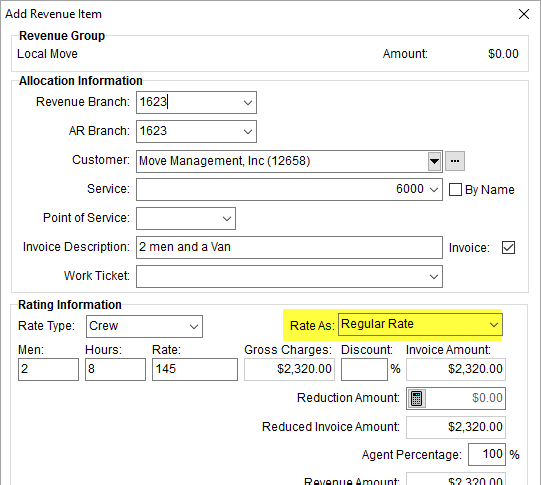 The option to manually set the Rate As option appears when adding or editing revenue through various screens, such as the Add Revenue Item screen.