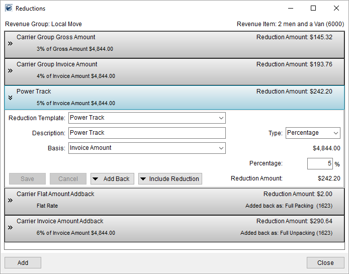 MoversSuite can be set up to automatically apply reductions at the order level upon Revenue Entry. See Reduction Profile and Reduction Profile Setup for more information on this functionality. Using this Reduction Profile also applies the reductions parameters set within Reduction Templates when manually creating reductions through Add Revenue Group and Add Revenue Item.