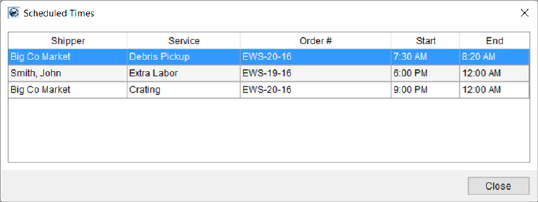 Scheduled Times dialog displays the services assigned for a person on a specific date. It provides information on the services that the employee is assigned for the given Selected Date of the service. This is helpful to know when this employee is available to be scheduled for additional work.