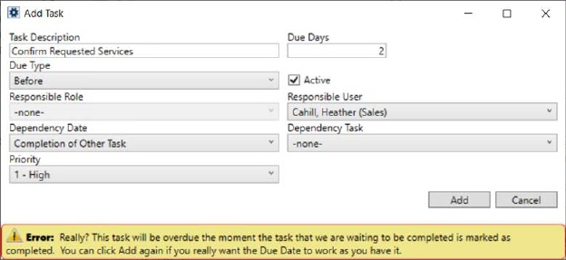 In the following example (Figure 19), the same task item from the example above (Figure 197), is now configured to add a due date based on the completion of the Confirm order information task. The Dependency Task is a different task associated to the same Tasks Setup record being updated.