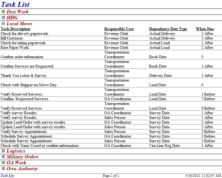 For a report summary of the task lists by role, you can view the Task List Report. This report displays the Task Description, which Account Profile the record is assigned to, the Dependency Date, and the Due Type. Group options allow you to view by Account Profile or by Responsible User.