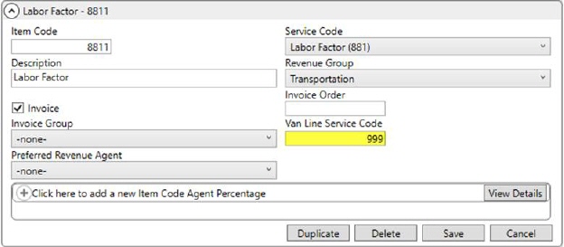 When this type is encountered, MoversSuite checks for an alternate Item Code record based on the same Service Code as the original Item Code. If one exists and the Van Line Service Code is also set to 999, then application references the alternate Item Code when items import; this alternate Item Code also available within the Transactions grid.