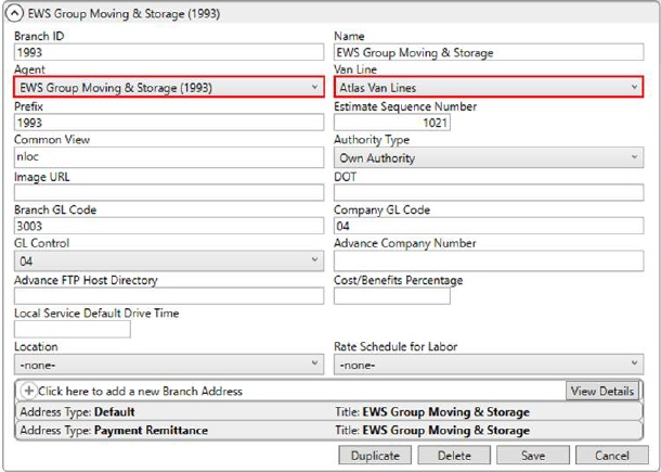For the branch of the orders you wish to have access to the Atlas Integration, link their Branch Setup record to the Agent and Van Line that link to Atlas Van Lines.