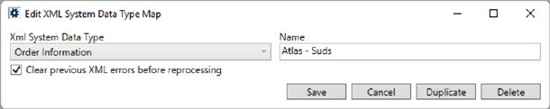 To support the Atlas SUDS Order Download processes, create a mapping for Atlas - Suds linked to the Xml System Data Type Map of Order Information.