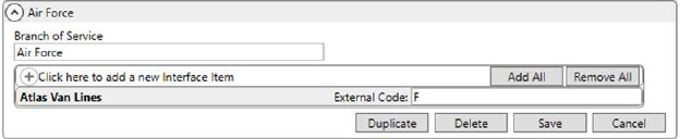 Use the Branch of Service Setup to map military service codes supported by Atlas to orders uploaded from MoversSuite.