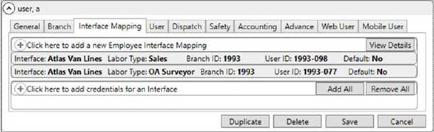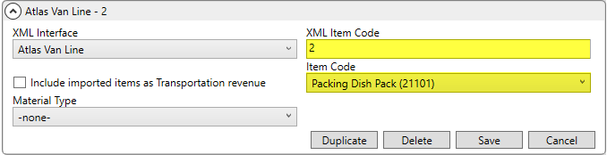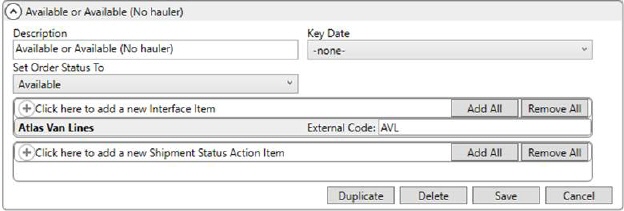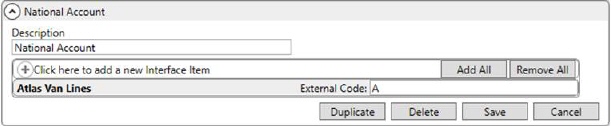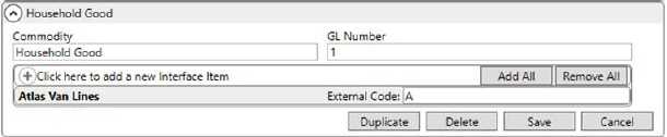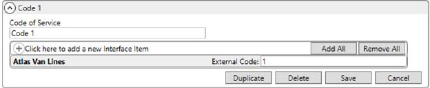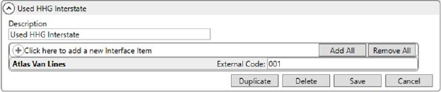 Establish an interface for the Atlas Van Lines within XML Interface Setup. Link this record to the established Van Line Item for Atlas and assign an External Code of A.