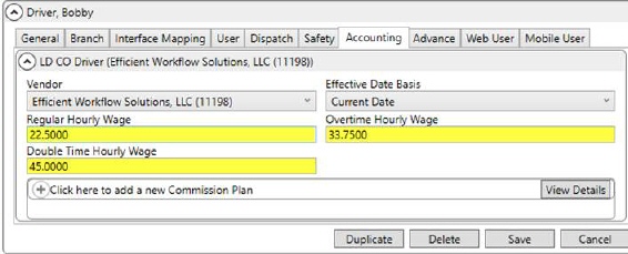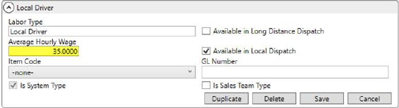 If you wish for a more granular labor expense, then you can assign actual wage values for each of your local crew and drivers you want included in Job Costing. Set the Regular Hourly Wage, Overtime Hourly Wage, and Double Time Hourly Wage within the Accounting tab for the appropriate Labor Type on each employee Personnel Setup record that you want included.
