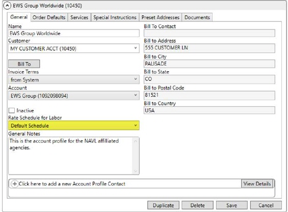 To enable a Rate Schedule for Labor record, assign it through the Rate Schedule for Labor setting within Account Profile Setup and Branch Setup (refer to Step 5 and Step 6). NOTE: If you assign a rate schedule to both the branch and to a profile, the schedule associated to the profile supersedes that set on the branch.