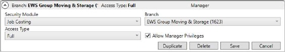 The Job Costing module is not branch specific. Therefore, only one Job Costing specification need be added to a Security Profile Setup record to grant user access to the module.