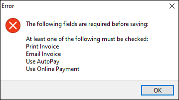 This error indicates that one invoice option must be defined within the Billing Record itself or on the Payment Setup tab. The following is a list of invoice related settings: On the Billing Record (refer to descriptions following this section for details): Print Invoice Email Invoice On the Payment Setup tab (refer to the topic for details): Use AutoPay (see Email AutoPay Receipt option) Use Online Payment
