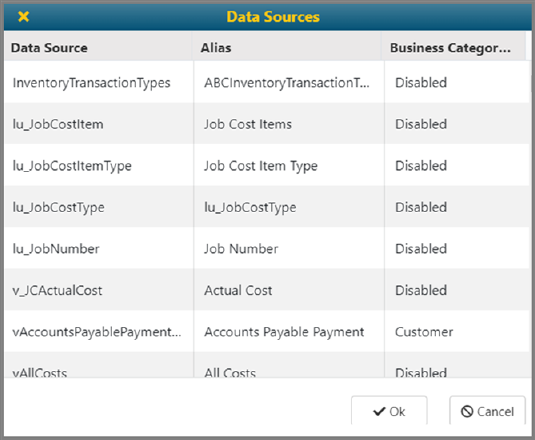 This screen will allow Jonas Administrators to change friendly names (aliases). Administrators can also change the Business Category to which a data source is tied.