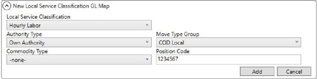 For each defined Classification, you can create any number of mapping records within the Local Service Classification GL Map Setup. These records identify the Position Code for the Classification based on any combination of Authority Type, Move Type Group, and/or Commodity Type (Commodity Setup) set on the order.