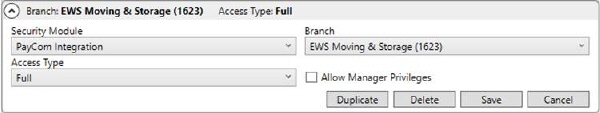 To grant access to the Export Punches to Payroll screen, verify that there is a record established for each supported branch to the PayCom Integration Security Module. Only those branches linked to a person’s Security Profile Setup record can be selected from the Branch field within the Export Punches to Payroll screen.