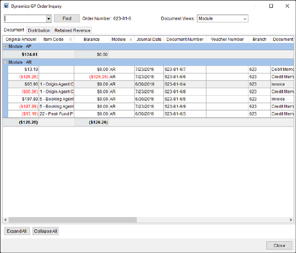 Use the Dynamics GP Order Inquiry screen to display the actual posting information for a particular order. The application references data from Microsoft Dynamics GP and displays it within three categorized tabs, as described in the table below.
