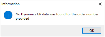 In the event that no matching data is available within Microsoft Dynamics GP for the order, then the application returns a warning to the user.