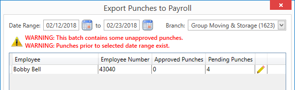 Total number of qualified punches that are not yet approved for each person displays in this column. NOTE: You will receive a warning if you attempt to transmit the batch that includes pending (unapproved) punches. |