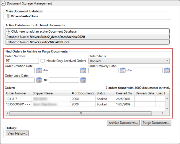 NOTE: During this search, the application automatically includes all archived orders having a “[A]” sign appended to it. Also, orders with active storage are included in the search for you to keep all the pertinent documents, such as invoices, for active customers.