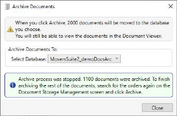 At any point during the archiving process, you can stop the process by clicking the ‘Stop’ button on the prompt. This will stop archiving the documents and will let you know of the total documents that have been archived during that time.