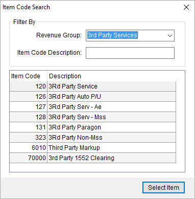 The Item Code Search dialog allows you to select an Item Code from a list of all available Item Code records. It also allows you to filter the list to a particular Revenue Group and/or Item Code Description.